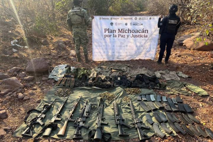 Como parte de las acciones operativas implementadas en el marco del Plan Michoacán por la Paz y la Justicia, elementos de la Secretaría de Seguridad Pública (SSP), en coordinación con la Secretaría de Marina (Marina), aseguraron armamento de alto poder y equipo táctico en este municipio. En recorridos de reconocimiento en una zona serrana, personal de la Guardia Civil y de la Marina localizó un campamento presuntamente utilizado para a...