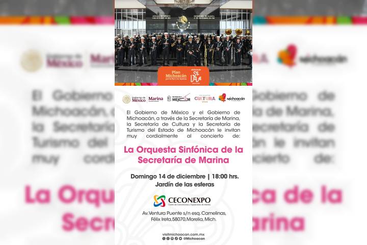 NOTICIAS 13/12/2025Vive el concierto de la Orquesta Sinfónica de la Secretaría de Marina, en el CeconexpoVive una experiencia única y disfruta del concierto que la Orquesta Sinfónica de la Secretaría de Marina ofrecerá mañana domingo 14 de diciembre en el Centro de Convenciones y Exposiciones de Morelia (Ceconexpo).