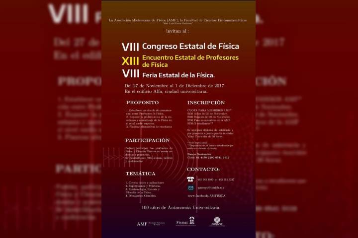 Durante este mes de noviembre y a lo largo de una semana, la Facultad de Ciencias FÃsico Matemáticas de la Universidad Michoacana de San Nicolás de Hidalgo, será la sede del VIII Congreso Estatal de FÃsica, XIII Encuentro Estatal de Profesores de FÃsica y VIII Feria Estatal de la FÃsica, donde se abordarán temas importantes en el área, relacionados con los avances de la ciencia en la región y nuevas formas didácticas para la enseñan... Ver más...