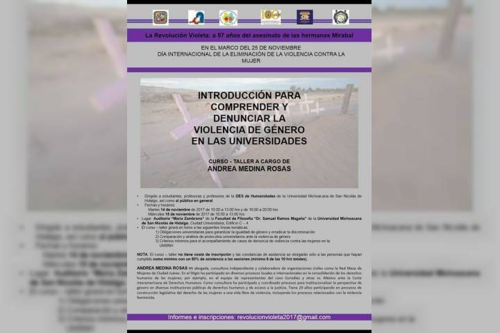 Ante la importancia de realizar acciones para disminuir los Ãndices de violencia de género y en el marco del DÃa Internacional de la Eliminación de la Violencia contra la mujer, la Universidad Michoacana de San Nicolás de Hidalgo, a través de la Facultad de FilosofÃa "Dr. Samuel Ramos Magaña" invita al Curso-taller "Introducción para comprender y denunciar la violencia de género en las universidades".