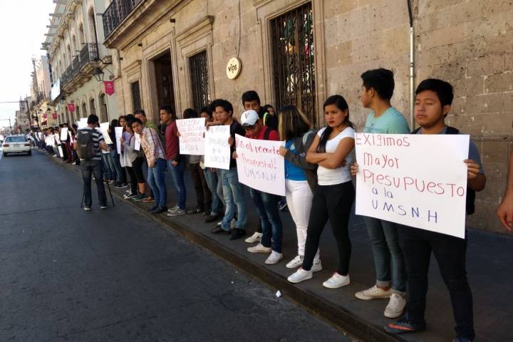 Estudiantes nicolaitas se manifestaron este lunes frente al Congreso de Michoacán, para exigir a los profesores de la Universidad Michoacana de San Nicolás de Hidalgo, regresen a las aulas a impartir la formación académica.