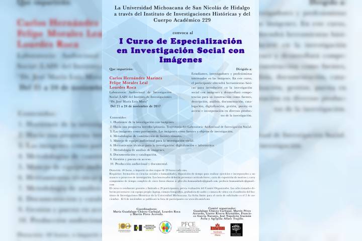 La Universidad Michoacana de San Nicolás de Hidalgo, a través del Instituto de Investigaciones Históricas y del Cuerpo Académico 229, invita a la comunidad universitaria al Primer Curso de Especialización en Investigación Social con Imágenes, que se llevará a cabo en los próximos días en las instalaciones del propio Instituto.