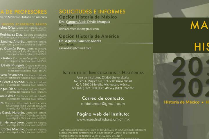 El Instituto de Investigaciones Históricas de la Universidad Michoacana de San Nicolás de Hidalgo dio a conocer a la comunidad universitaria interesada, que la recepción de solicitudes para participar en el proceso de selección de ingreso al Programa de Maestría en Historia para el periodo 2018-2020, se amplió hasta el 17 de noviembre próximo.
