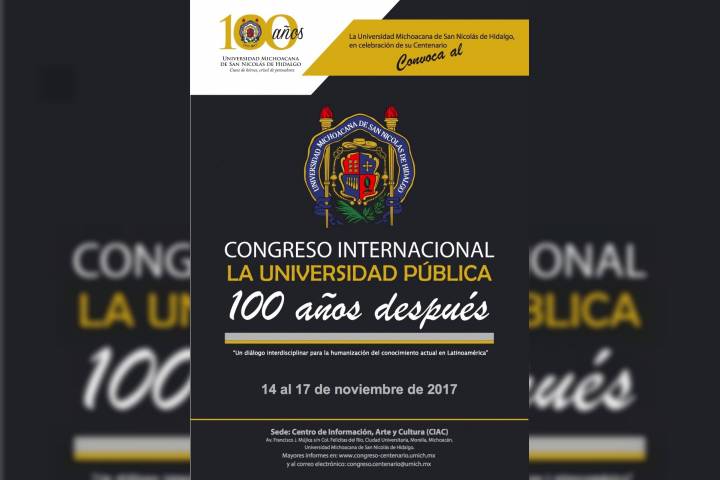 Como parte de las actividades de la celebración de su Centenario, la Universidad Michoacana de San Nicolás de Hidalgo convoca a participar en el Congreso Internacional la Universidad Pública Cien Años Después: "Un diálogo interdisciplinar para la humanización del conocimiento actual en Latinoamérica" que se desarrollará del 14 al 17 de noviembre de 2017.