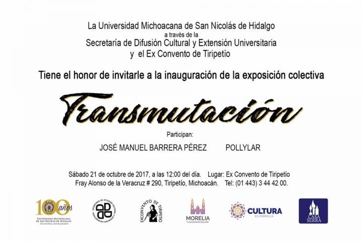 La Universidad Michoacana de San Nicolás de Hidalgo, a través de la Secretaría de Difusión Cultural y Extensión Universitaria y el Ex Convento de Tiripetío, invita a la inauguración de la exposición colectiva "Transmutación", autoría del destacado artista colombiano José Manuel Barrera Pérez.