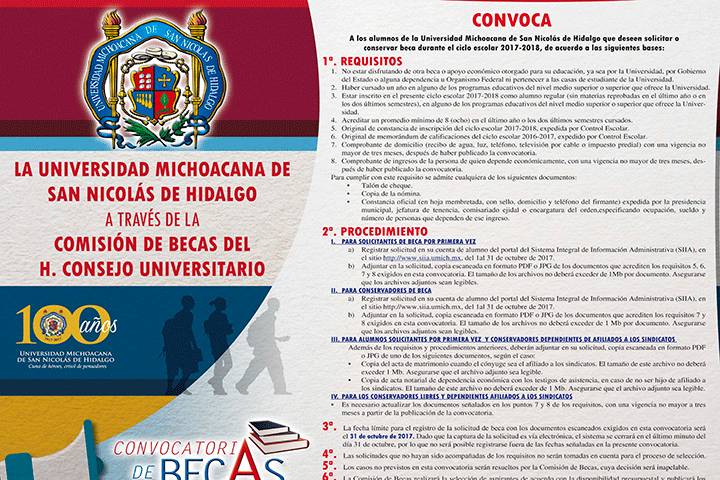 NOTICIAS 05/10/2017Abierta convocatoria becas de la UMSNH para el ciclo escolar 2017-2018La Universidad Michoacana de San Nicola?s de Hidalgo a través de la Comisión de Becas del H. Consejo Universitario dio a conocer la convocatoria para los alumnos que deseen solicitar o conservar beca durante el ciclo escolar 2017-2018.