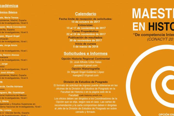 Atendiendo las necesidades de sus egresados de licenciatura para continuar con sus estudios profesionales, la Facultad de Historia dependiente de la Universidad Michoacana de San Nicolás de Hidalgo, se encuentra a pocos días de cerrar el periodo de inscripciones para su Programa de Maestría en Historia con opciones en Historia Regional Continental e Historiografía.