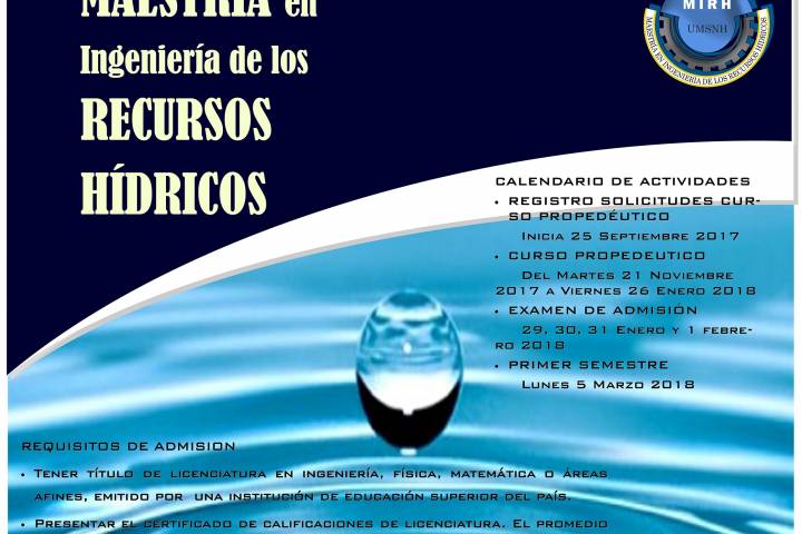 Como una opción más para que los egresados de licenciatura puedan continuar con su formación profesional, la Universidad Michoacana de San Nicolás de Hidalgo, a través de la División de Estudios de Posgrado de la Facultad de Ingeniería Civil invita a las personas interesadas que cuenten con estudios de licenciatura en Ingeniería Civil o áreas afines, a ingresar a su programa de Maestría en Ingeniería de los Recursos Hídricos.