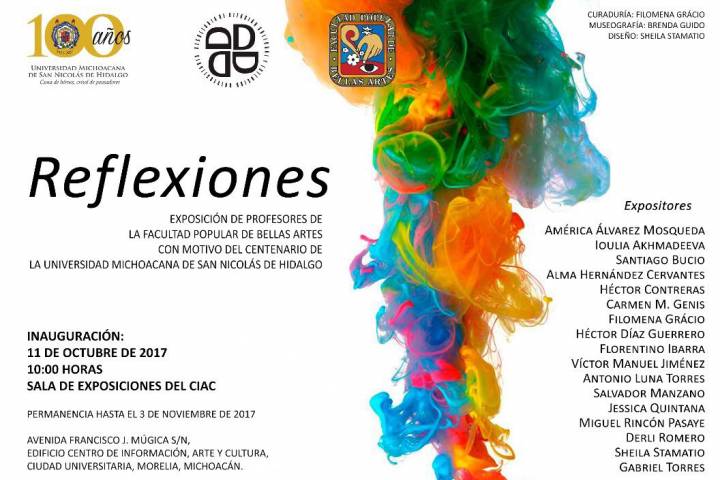 Con motivo del próximo Centenario de la Universidad Michoacana de San Nicolás de Hidalgo que se celebrará el domingo 15 de octubre, la Facultad Popular de Bellas Artes dependiente de la institución educativa, ofrecerá a la comunidad universitaria y público en general la exposición "Reflexiones".