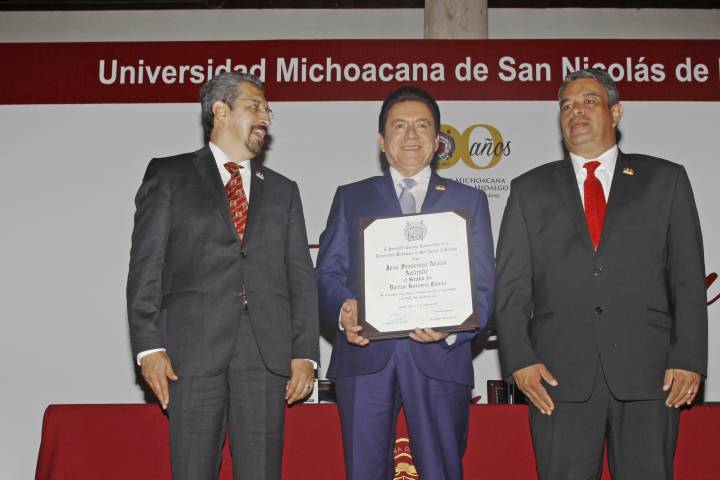 La Universidad Michoacana de San Nicolás de Hidalgo se fortalece con el esfuerzo, compromiso y talento de dos ejemplos de vida a seguir, quienes han aportado al campo del Arte y la Economía saberes invaluables al servicio de la humanidad: José Francisco Araiza Andrade y Robert Cox Merton, afirmó el rector Medardo Serna González.