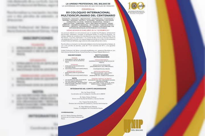 La Universidad Michoacana de San Nicolás de Hidalgo, a través de la Unidad Profesional del Balsas lanza la convocatoria para participar en el XII Coloquio Internacional Multidisciplinario del Centenario, a realizarse del 4 al 7 de diciembre próximos en la ciudad de Huetamo, Michoacán