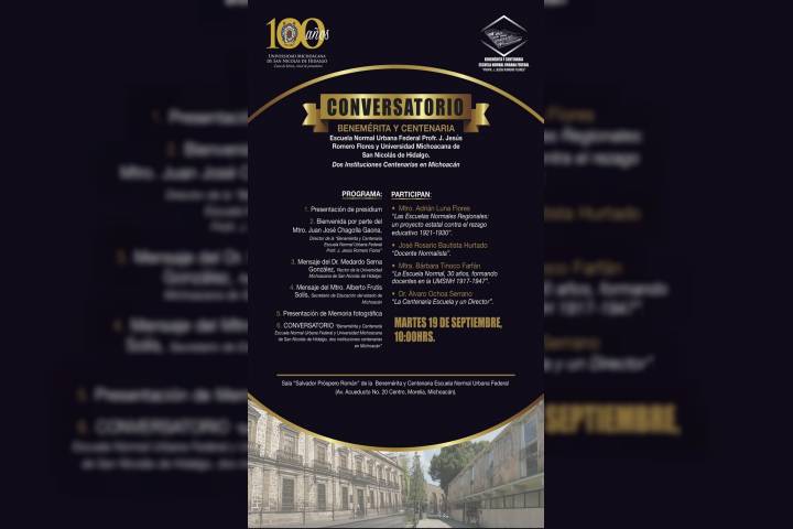 En el año de su Centenario, la Máxima Casa de Estudios del Estado, participarán este martes en el Conversatorio Benemérita y Centenaria Escuela Normal Urbana Federal Profr. J. Jesús Romero Flores" y Universidad Michoacana de San Nicolás de Hidalgo: Dos instituciones Centenarias en Michoacán".