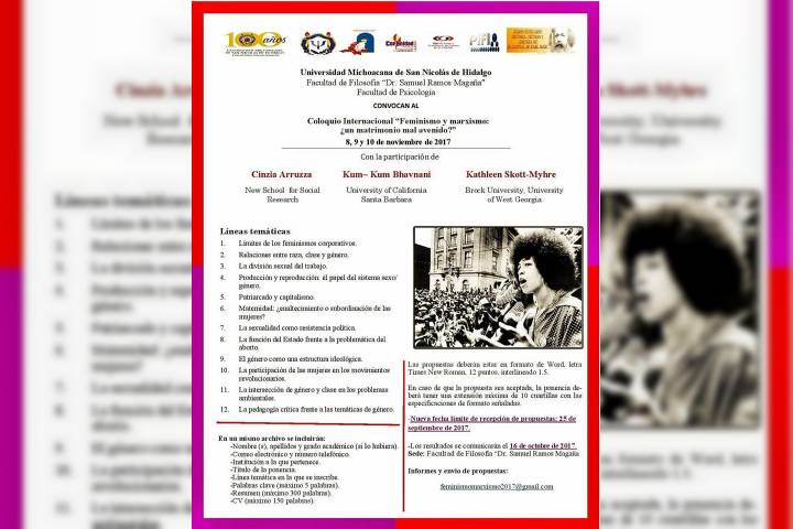 La Universidad Michoacana de San Nicolás de Hidalgo, a través de sus facultades de Filosofía y Psicología, anuncia la prórroga para la recepción de ponencias del Coloquio Internacional "Feminismo y marxismo: ¿un matrimonio mal avenido?".