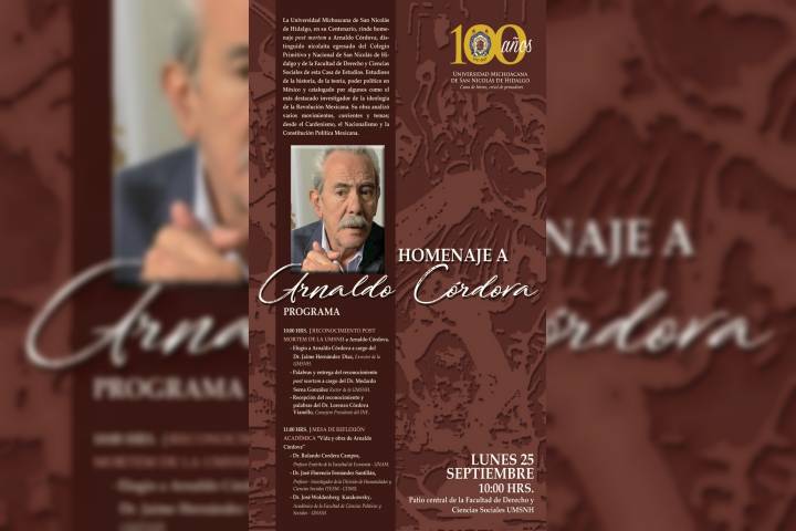 La Universidad Michoacana de San Nicolás de Hidalgo en el año de su Centenario, rendirá un homenaje póstumo al doctor Arnaldo Córdova, distinguido nicolaita egresado del Colegio Primitivo y Nacional de San Nicolás de Hidalgo y de la Facultad de Derecho y Ciencias Sociales de esta Casa de Estudio.