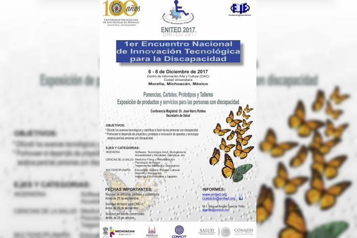 Como un evento más conmemorativo del Centenario de la Universidad Michoacana de San Nicolás de Hidalgo, la Facultad de Ingeniería Eléctrica será anfitriona del Primer Encuentro Nacional de Innovación Tecnológica para la Discapacidad.