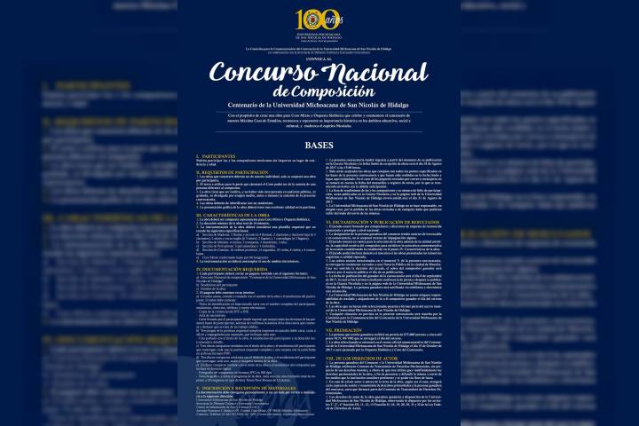 Este lunes 11 de septiembre se hará el anuncio oficial sobre el ganador del Concurso Nacional de Composición "Centenario de la Universidad Michoacana de San Nicolás de Hidalgo", obra musical para celebrar los 100 años de fundación de la institución.