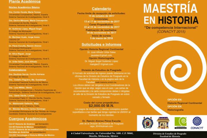 Continúa abierta la recepción de solicitudes para ingresar a la Maestría en Historia, que ofrece la Facultad de Historia de la Universidad Michoacana de San Nicolás de Hidalgo, a través de la División de Estudios de Posgrado.
