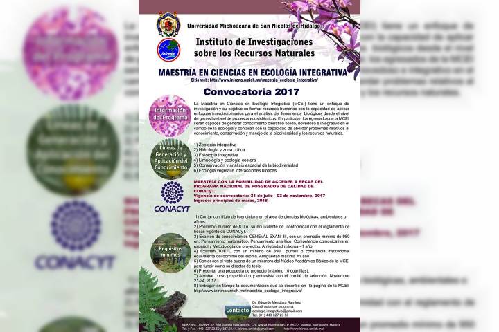 El Instituto de Investigaciones sobre los Recursos Naturales de la Universidad Michoacana de San Nicolás de Hidalgo (INIRENA), convoca a todos los egresados de carreras de ciencias biológicas, ambientales y afines a participar en la convocatoria para cursar la Maestría en Ciencias en Ecología Integrativa, la cual forma parte del Programa Nacional de Posgrados de Calidad Conacyt (PNPC).
