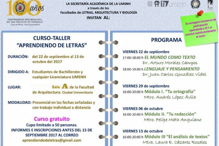 Con la finalidad de que los estudiantes nicolaitas adquieran las herramientas gramaticales necesarias para redactar correctamente, con claridad en los mensajes y sin errores ortográficos, la Secretaría Académica de la Universidad Michoacana de San Nicolás de Hidalgo, a través de las Facultades de Letras, Arquitectura y Biología, invitan a la comunidad estudiantil, a participar en el Curso-Taller "Aprendiendo Letras", que dará inicio dura... Ver más...