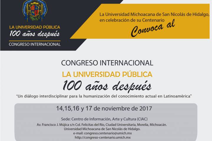 En el marco de la celebración de su Centenario, la Universidad Michoacana de San Nicolás de Hidalgo convoca a la comunidad nicolaita a participar en el Congreso Internacional la Universidad Pública Cien Años Después: "Un diálogo interdisciplinar para la humanización del conocimiento actual en Latinoamérica".
