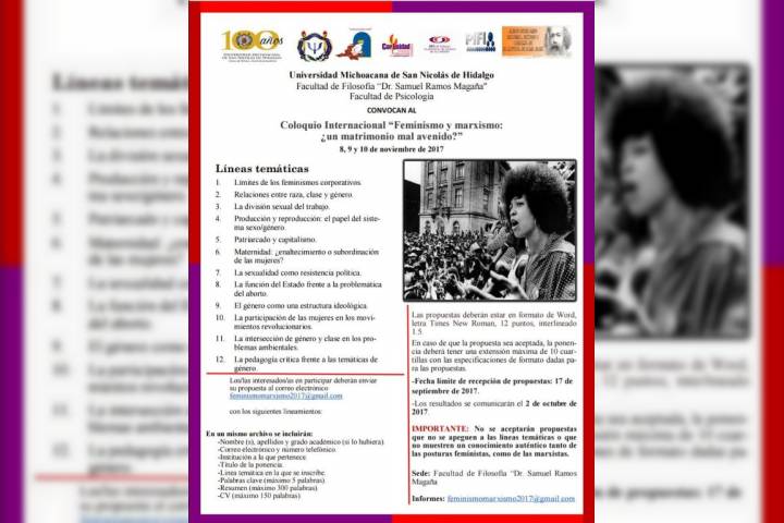NOTICIAS 03/09/2017Oportunidad de participar en Coloquio sobre feminismo y marxismoLas facultades de Filosofía "Dr. Samuel Ramos" en coordinación con la de Psicología de la Universidad Michoacana de San Nicolás de Hidalgo, invitan a estudiantes, pasantes y académicos nicolaitas, a participar en el Coloquio Internacional "Feminismo y marxismo: ¿un matrimonio mal avenido?