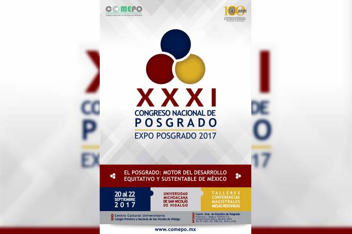 En el marco del Centenario de su fundación, la Universidad Michoacana de San Nicolás de Hidalgo en coordinación con el Consejo Mexicano de Estudios de Posgrado (COMEPO) invita a la comunidad nicolaita y demás instituciones educativas al XXXI Congreso Nacional de Posgrado y a la Expo Posgrado 2017.