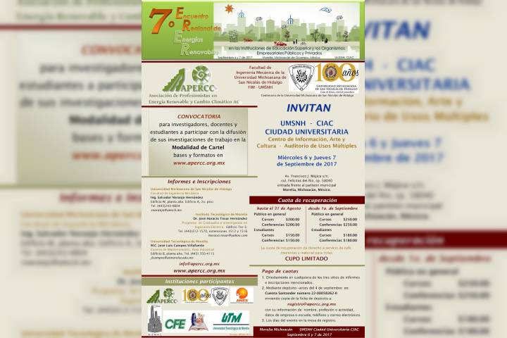 La Universidad Michoacana de San Nicolás de Hidalgo a través de su Facultad de Ingeniería Mecánica invita a empresarios, servidores públicos, investigadores, académicos, estudiantes de educación superior y público en general, al "7° Encuentro Regional de Energías Renovables", que inicia este jueves en el Centro de Información, Arte y Cultura.