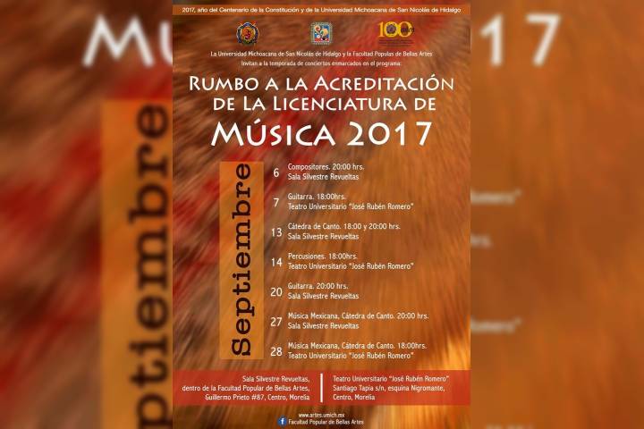 Durante el mes de septiembre, la Facultad Popular de Bellas Artes de la Universidad Michoacana de San Nicolás de Hidalgo, ofrecerá una serie de eventos culturales, que agrupó bajo el título de "Rumbo a la Acreditación de la Licenciatura de Música 2017".