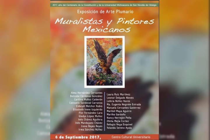 Con motivo del Centenario de la Universidad Michoacana de San Nicolás de Hidalgo, el grupo de Arte Plumaria "Quetzal" invita a la inauguración de exposición colectiva titulada "Muralistas y Pintores Mexicanos", la cual podrá admirarse a partir de este miércoles en el Centro Cultural Universitario.