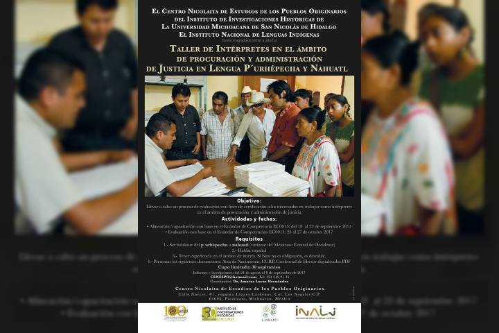 El Centro Nicolaita de Estudios de los Pueblos Originarios (CENEsPO), dependiente del Instituto de Investigaciones Históricas de la Universidad Michoacana de San Nicolás de Hidalgo, en conjunto con el Instituto Nacional de Lenguas Indígenas invitan al "Taller de Interpretes en el ámbito de procuración y administración de Justicia en Lengua P'urhépecha y Náhuatl".