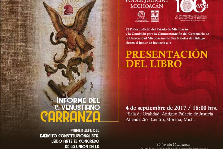Dentro de las ediciones especiales que realiza la Universidad Michoacana de San Nicolás de Hidalgo con motivo de los festejos de su Centenario, el próximo lunes 4 de septiembre se presentará la obra "Informe del C. Venustiano Carranza, primer jefe del Ejército Constitucionalista".