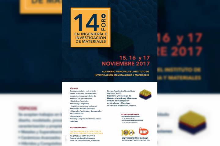 Como un espacio para el intercambio de conocimientos y experiencias entre investigadores, especialistas y estudiantes de licenciatura y posgrado, el Instituto de Investigación en Metalurgia y Materiales de la Universidad Michoacana de San Nicolás de Hidalgo invita al 14º Foro en Ingeniería e Investigación de Materiales.