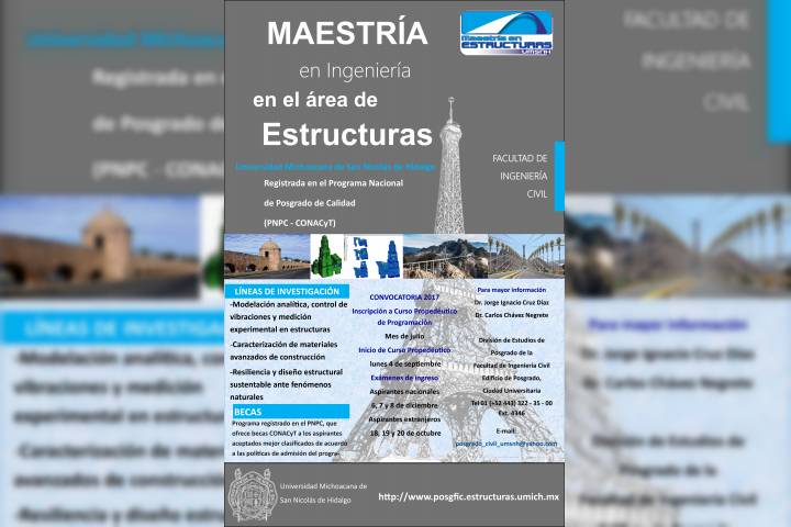 La Facultad de Ingeniería Civil de la Universidad Michoacana de San Nicolás de Hidalgo, a través de la División de Estudios de Posgrado convoca a las personas interesadas, que cuenten con estudios de licenciatura en Ingeniería Civil o áreas afines, a ingresar a su programa de Maestría en Ingeniería en el Área de Estructuras.