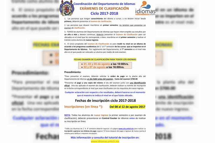 NOTICIAS 01/08/2017Esta semana, exámenes de clasificación en la Dirección de Idiomas de la UMSNH