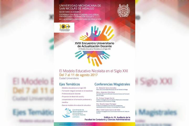 La Universidad Michoacana de San Nicolás de Hidalgo a través de su Secretaría Académica, la Coordinación de Responsabilidad Social Universitaria y Formación Docente así como la Red Académica Universitaria en Educación, llevarán a cabo del 7 al 11 de agosto, el XVIII Encuentro Universitario de Actualización Docente "El modelo educativo nicolaita en el siglo XXI".