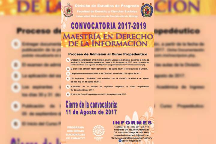 La Facultad de Derecho y Ciencias Sociales de la Universidad Michoacana de San Nicolás de Hidalgo, a través de la División de Estudios de Posgrado invita a los interesados en participar en el proceso de admisión al curso propedéutico para su programa de Maestría en Derecho de la Información 2017-2019.