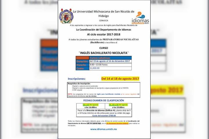 La Universidad Michoacana de San Nicolás de Hidalgo, a través de la Dirección de Idiomas, informa que esta es la última semana para que los jóvenes estudiantes de preparatorias de la Casa de Estudios e interesados en general, se inscriban al curso de Ingles Junior para bachillerato.