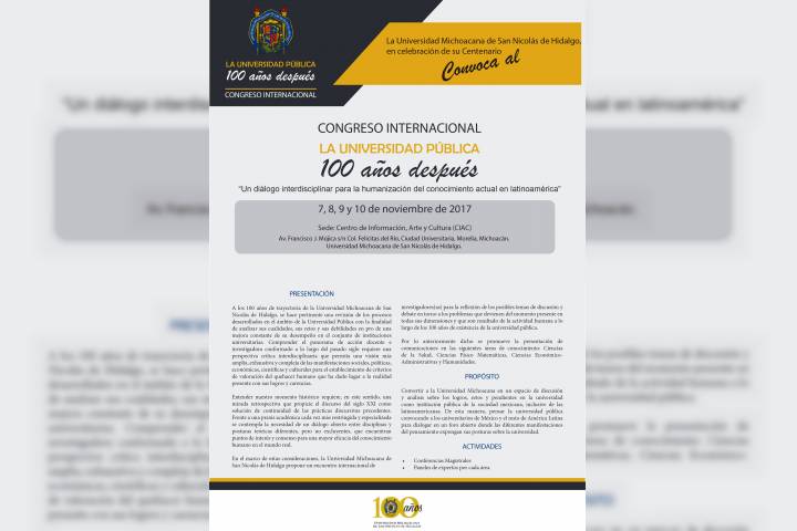Como parte de la conmemoración de su Centenario, la Universidad Michoacana de San Nicolás de Hidalgo invita a estudiantes universitarios, profesores e investigadores a participar en el Congreso Internacional la Universidad Pública Cien Años Después: "Un diálogo interdisciplinar para la humanización del conocimiento actual en Latinoamérica".