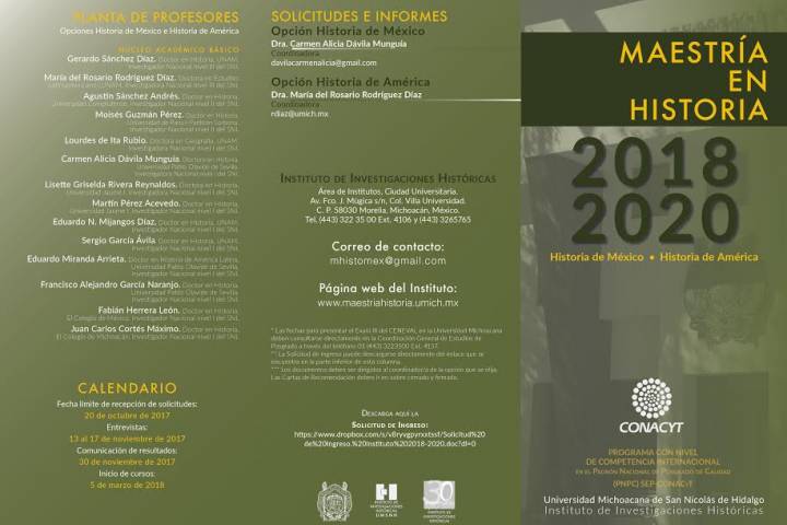 El Instituto de Investigaciones Históricas de la Universidad Michoacana de San Nicolás de Hidalgo dio a conocer a la comunidad universitaria interesada, que la recepción de solicitudes para participar en el proceso de selección de ingreso al Programa de Maestría en Historia para el periodo 2018-2020, se amplió hasta el 20 de octubre próximo.