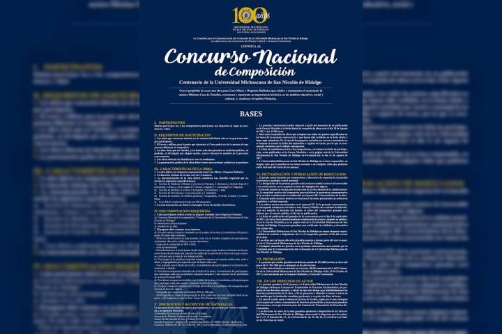 La Universidad Michoacana de San Nicolás de Hidalgo, a través de la Comisión para la Conmemoración del Centenario y la Secretaría de Difusión Cultural y Extensión Universitaria invita a los compositores mexicanos, a participar en la convocatoria del Concurso Nacional de Composición "Centenario de la Universidad Michoacana de San Nicolás der Hidalgo".