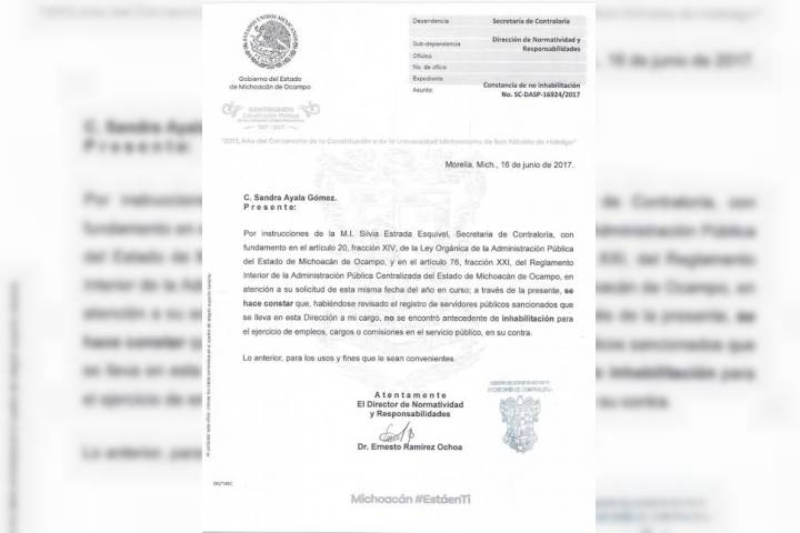 NOTICIAS 16/06/2017Falso que funcionaria designada en la UMSNH esté "inhabilitada"; lo avala Contraloría Es falso que la recién designada jefa del Departamento de Auditorios, Teatros e Infraestructura Deportiva de la Universidad Michoacana de San Nicolás de Hidalgo, Sandra Ayala Gómez, esté "inhabilitada" por la Secretaría de la Contraloría del Estado de Michoacán, para ocupar cargos públicos "hasta por seis años", como dolosamente se ha hecho creer.