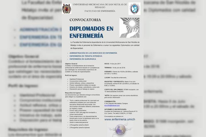 NOTICIAS 17/06/2017Diplomados en Enfermería con calidad de Especialidad en la UMSNHCon el propósito de fortalecer la formación de los profesionales en el área de enfermería, para satisfacer las necesidades de la población mexicana en relación con los diferentes servicios de especialidad, la Facultad de Enfermería dependiente de la Universidad Michoacana de San Nicolás de Hidalgo invita al personal en el área, a participar en el alguno de los Diplomados con calidad de Especialidad que ofrece la institución.