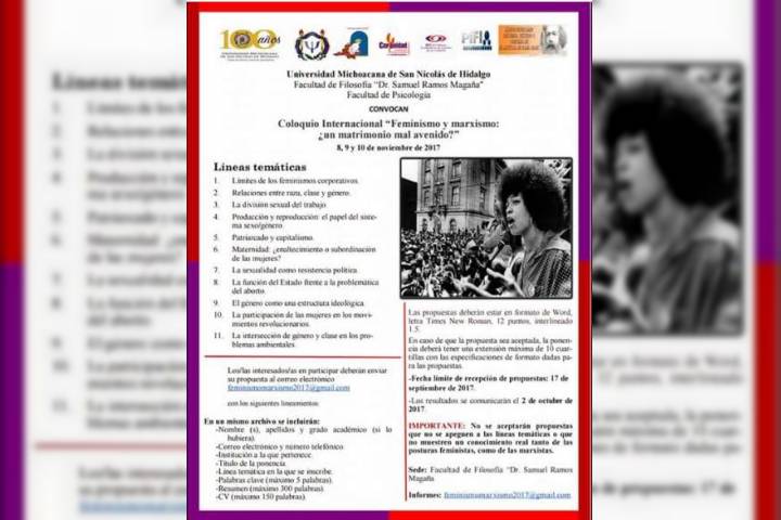 La Facultad de Filosofía "Dr. Samuel Ramos" de la Universidad Michoacana de San Nicolás de Hidalgo, en coordinación con la Facultad de Psicología invitan a estudiantes, pasantes y académicos nicolaitas, a participar en el próximo Coloquio Internacional "Feminismo y marxismo: ¿un matrimonio mal avenido?