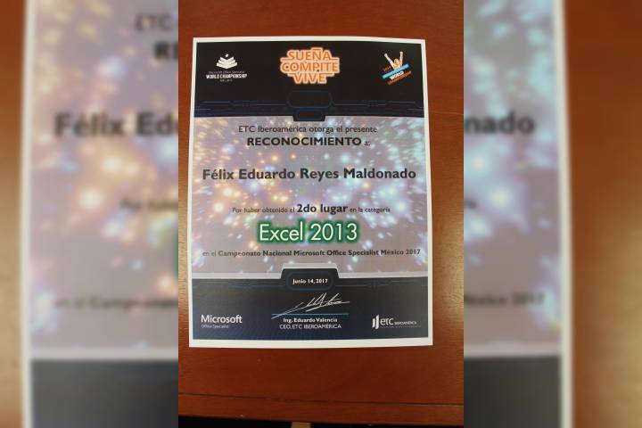 Diploma y medalla de Segundo Lugar en el manejo del programa Excel de Microsoft, obtuvo el alumno de segundo semestre de la Facultad de Ingeniería Eléctrica de la Universidad Michoacana de San Nicolás de Hidalgo, Félix Eduardo Reyes Maldonado, durante su participación en las tres etapas del concurso Microsoft Office Specialist 2017 Región Centro Sur.