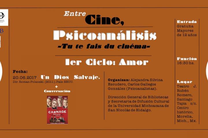 NOTICIAS 20/06/2017Continua el ciclo "Entre Cine, Psicoanálisis" en la UMSNHCon la colaboración de las psicoanalistas Alejandra Silvina Escudero y Carlos Gallegos González, la Universidad Michoacana de San Nicolás de Hidalgo a través de su Dirección General de Bibliotecas continua este martes con el ciclo fílmico "Entre Cine, Psicoanálisis" con la proyección de la película "Un día Salvaje" del afamado director, Roman Polanski.