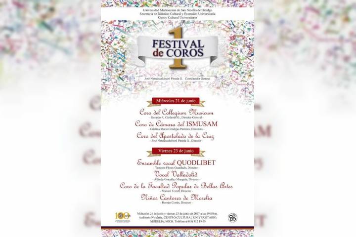 Como parte de las actividades artísticas y culturales que enmarcan el Centenario de la Universidad Michoacana de San Nicolás de Hidalgo, la Secretaría de Difusión Cultural y Extensión Universitaria y el Centro Cultural Universitario, invitan al Primer Festival de Coros.