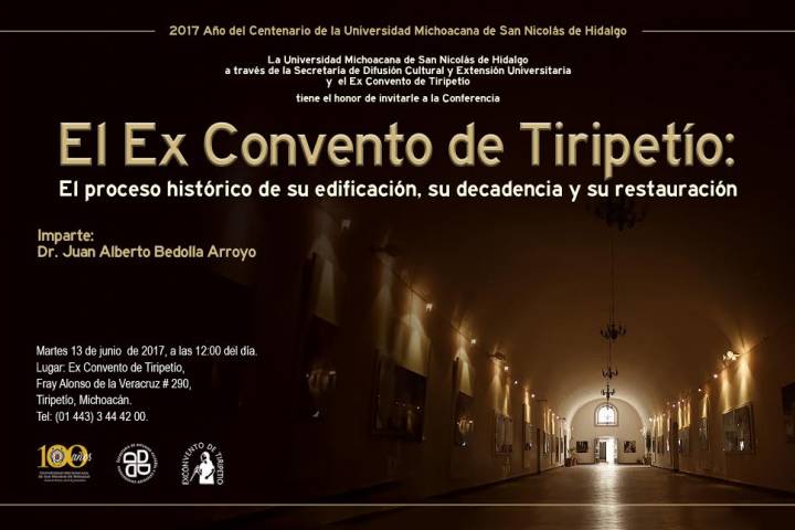 NOTICIAS 12/06/2017Ex convento de Tiripetío presenta conferencia sobre el proceso histórico de su construcciónLa Universidad Michoacana de San Nicolás de Hidalgo, a través de la Secretaría de Difusión Cultural y Extensión Universitaria invitan a la conferencia que dictará el doctor en Arquitectura, Juan Alberto Bedolla Arroyo, en el Ex convento de Tiripetío, este martes a las 12 del día.