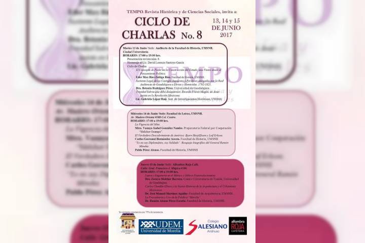 La DES de Humanidades de la Universidad Michoacana de San Nicolás de Hidalgo, la Universidad de Morelia y el Colegio Salesiano, invitan a la comunidad nicolaita y público en general al ciclo de conferencias número 8 a realizarse a partir de este martes 13 hasta el 15 de junio.