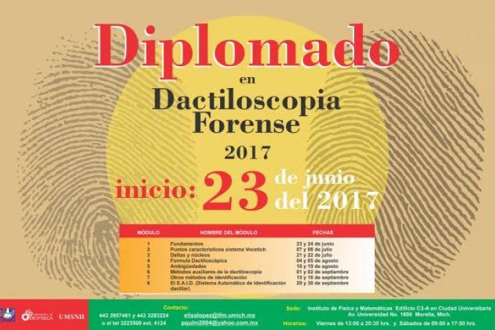 Debido a que la Dactiloscopia Forense es uno de los métodos más utilizados en los últimos tiempos para la identificación de culpables en asuntos criminales, la Universidad Michoacana de San Nicolás de Hidalgo, a través del Instituto de FÃsica y Matemáticas invita a los interesados a participar en el Diplomado en Dactiloscopia Forense 2017.