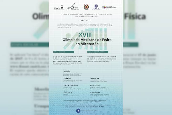La Facultad de Ciencias Físico Matemáticas de la Universidad Michoacana de San Nicolás de Hidalgo convoca a todos los estudiantes e la entidad a que participen en la edición XVIII de la Olimpiada Mexicana de Física en Michoacán.